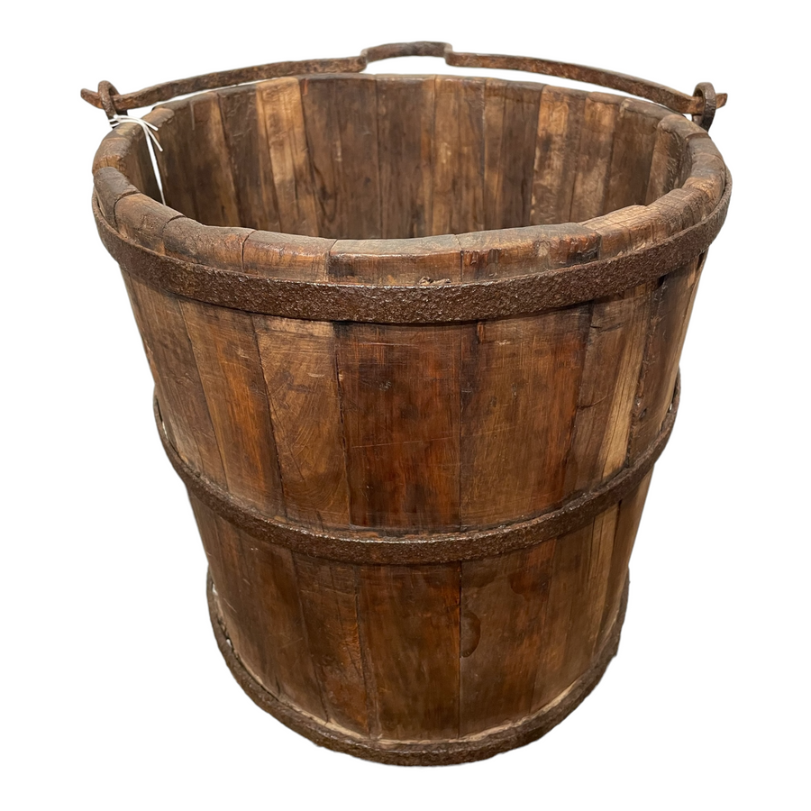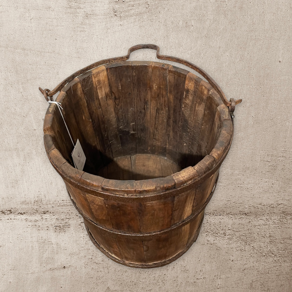 Antique wood vessels were handmade with a curved forged iron handle. High quality craftsmanship makes it super durable and lasted for hundred years. Its amber color patina and aged surface give this vessel a unique look of beauty. It is a wonderful decorative object and can also be a vase for flowers or could be perfect for a 10" planter.