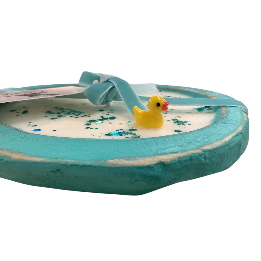 100% american farm grown soy wax infused with our Cool Water fragrance and handpoured into hand-carved turquoise panted round wood dough bowl with cotton lead-free wick and accented with velvet ribbon and a rubber ducky on top.