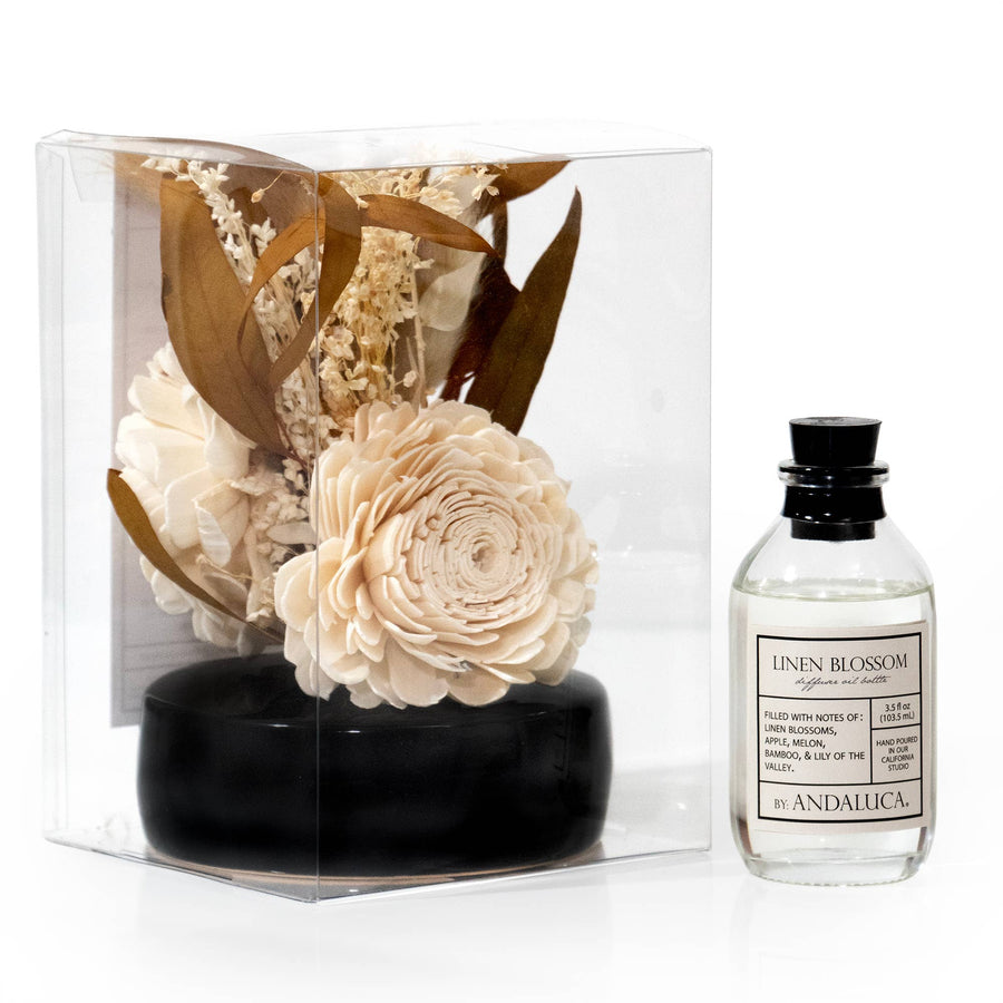 Our Linen Blossom Bouquet Diffuser comes with a chic ceramic vessel, a boisterous bouquet of natural beauty, and a glass bottle overflowing with fragrant diffuser oil. All these items will be sent to you in their own packages, so you can enjoy classic sophistication fragrance-wise, and modern visual vibes from the bundle of nature's wonders.