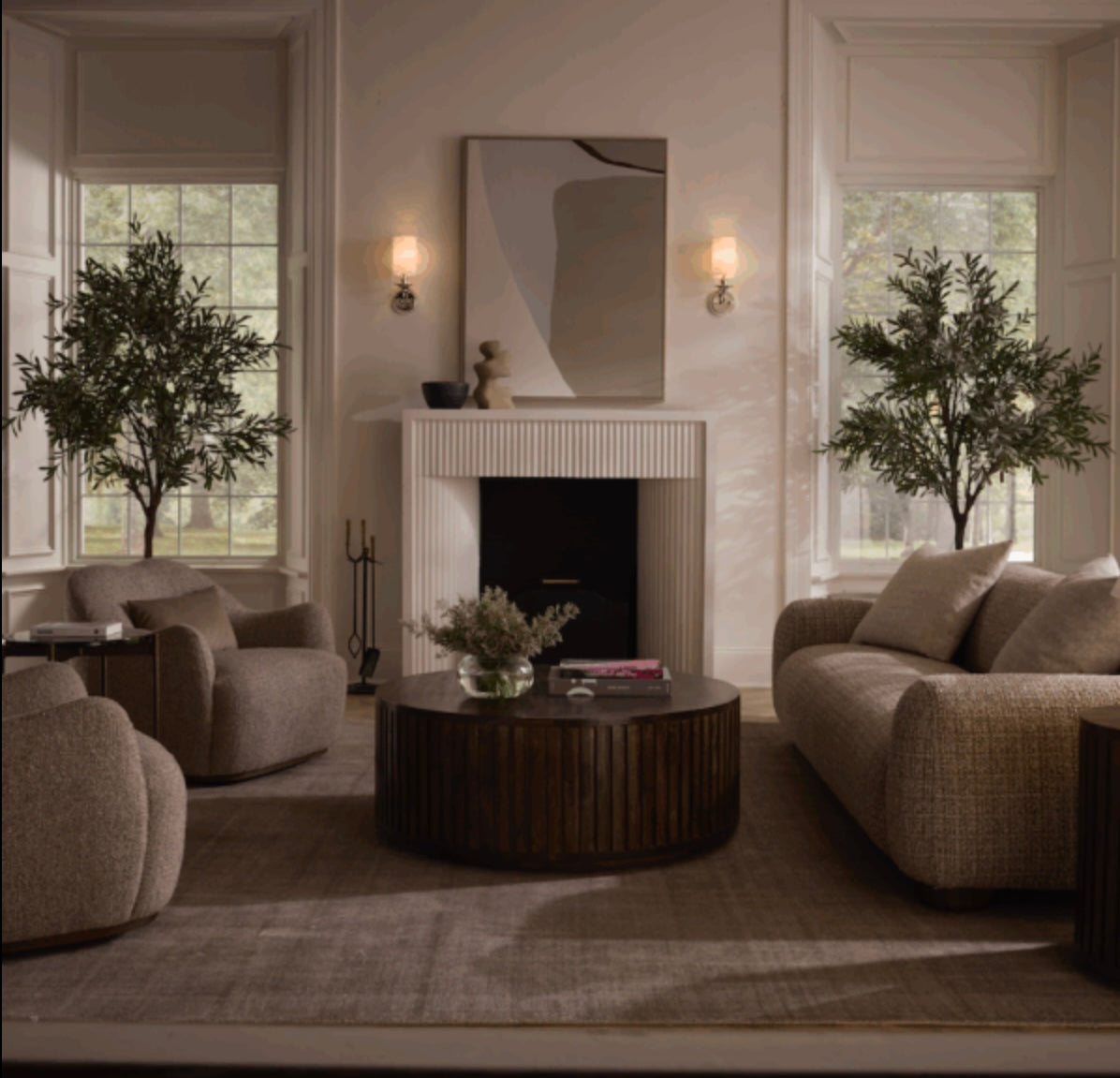 This refined coffee table is in an aged ash finish and a quite unique design.