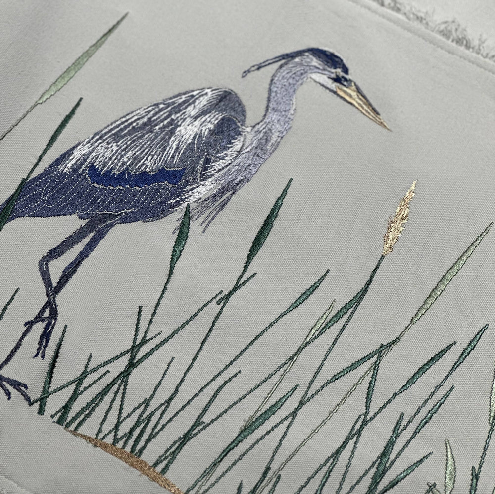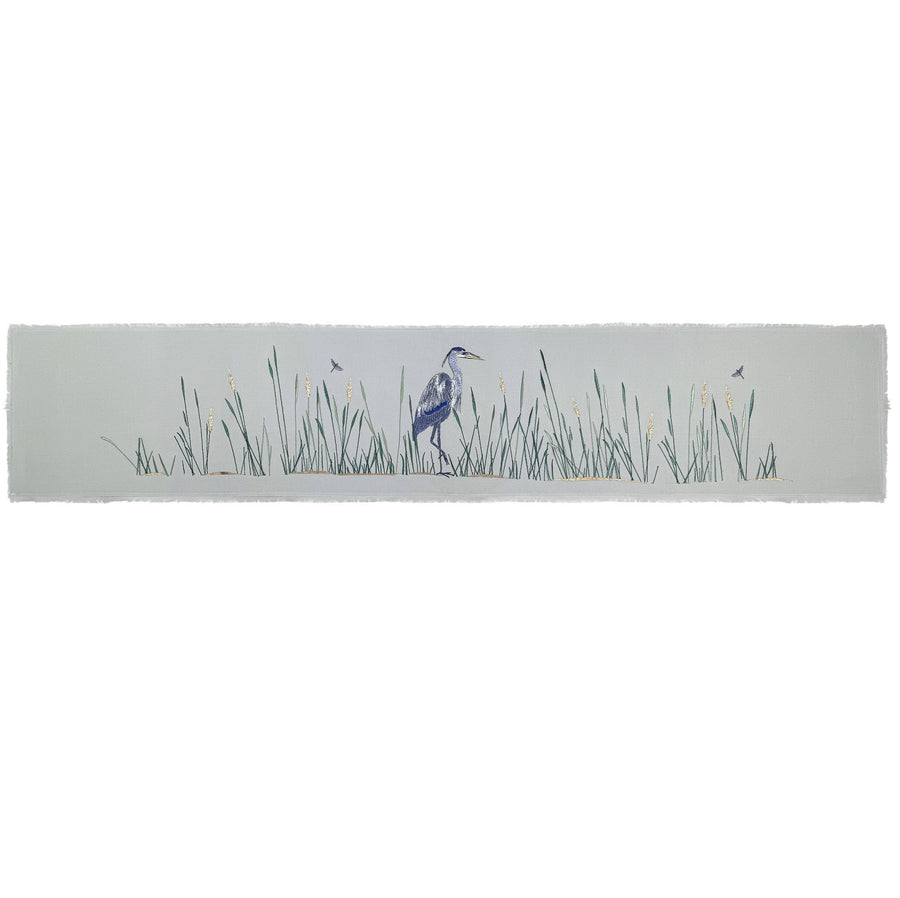 Elegantly embroidered and fringed table runner in a serene grey. Experience the grace and beauty of the Great Blue Heron as it stands gracefully in serene landscapes.