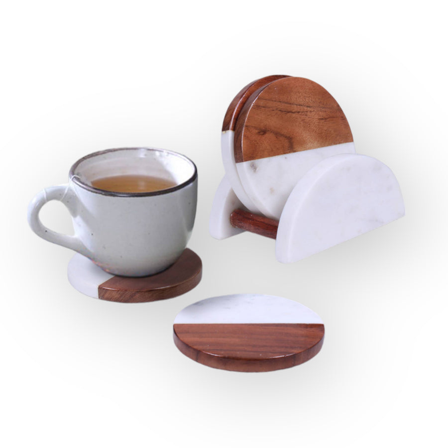 - Your set of 4 wood and marble coasters comes packed with a sturdy marble and wood stand that securely holds each coaster. It makes an appealing decor choice for any interior setting. Great for your coffee table, kitchen countertop or bar counter. PROTECT YOUR HOME'S SURFACES