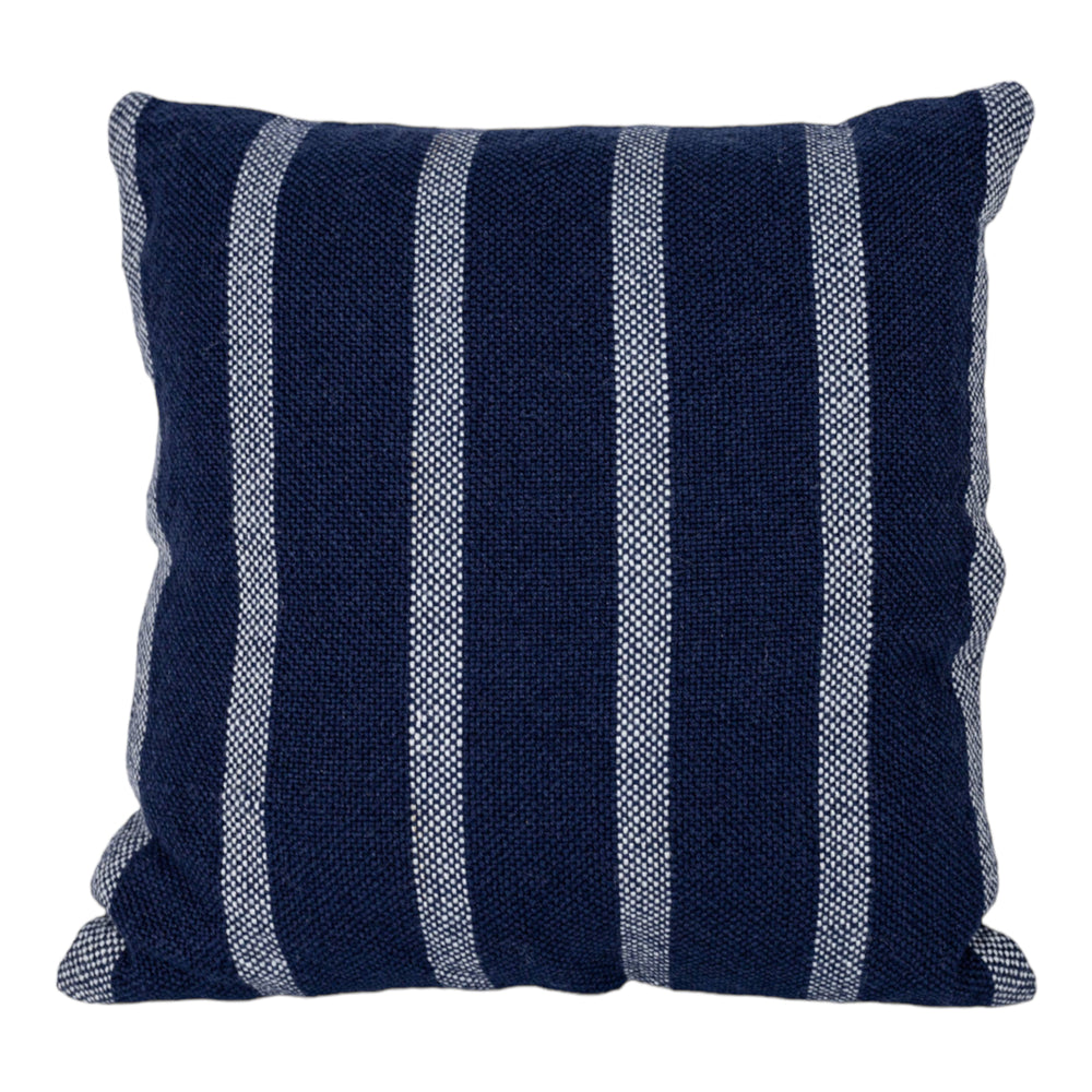The Cabana modern style pillow that is hand-woven with yarns created from recycled plastic bottles. Skinny cabana style stripes in white create a striking contrast from a woven navy-blue base. The navy blue backing on the pillow allows the clean edges to flow seamlessly for an elevated feel. -UV stabilized, suitable for indoors and outdoors. Handwoven in India. Handloomed by artisans using techniques passed down through generations. -Outdoor Use. Spot Clean Only.